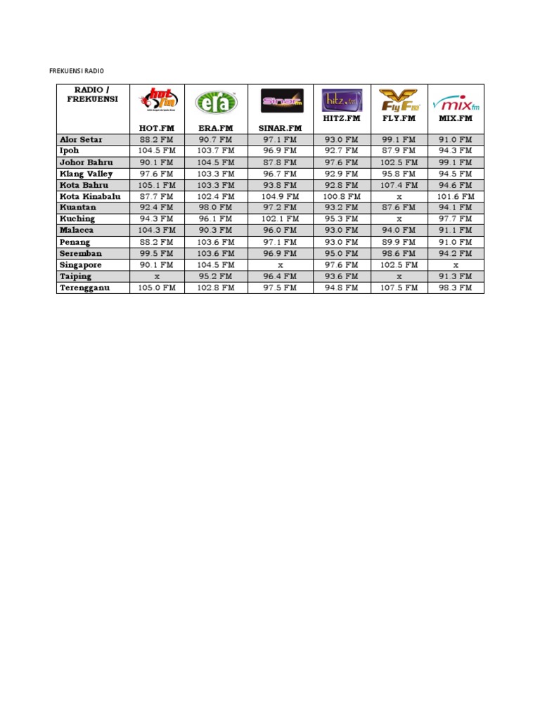 Frekuensi Radio Nasional FM. The contemporary hit radio station uses Malay language as to communicate with listeners. ERA Malaysia Transmitter frequencies.